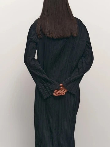 Платье длины макси из гофрированной ткани с вискозой в составе. Свободный крой, спущенная линия плеча, удлиненный широкий рукав и обработка швами наружу. Фактура гофре и отсутствие подклада придает платью воздушность. Модель отлично подойдет как для вечерних, так и для расслабленных повседневных образов.
