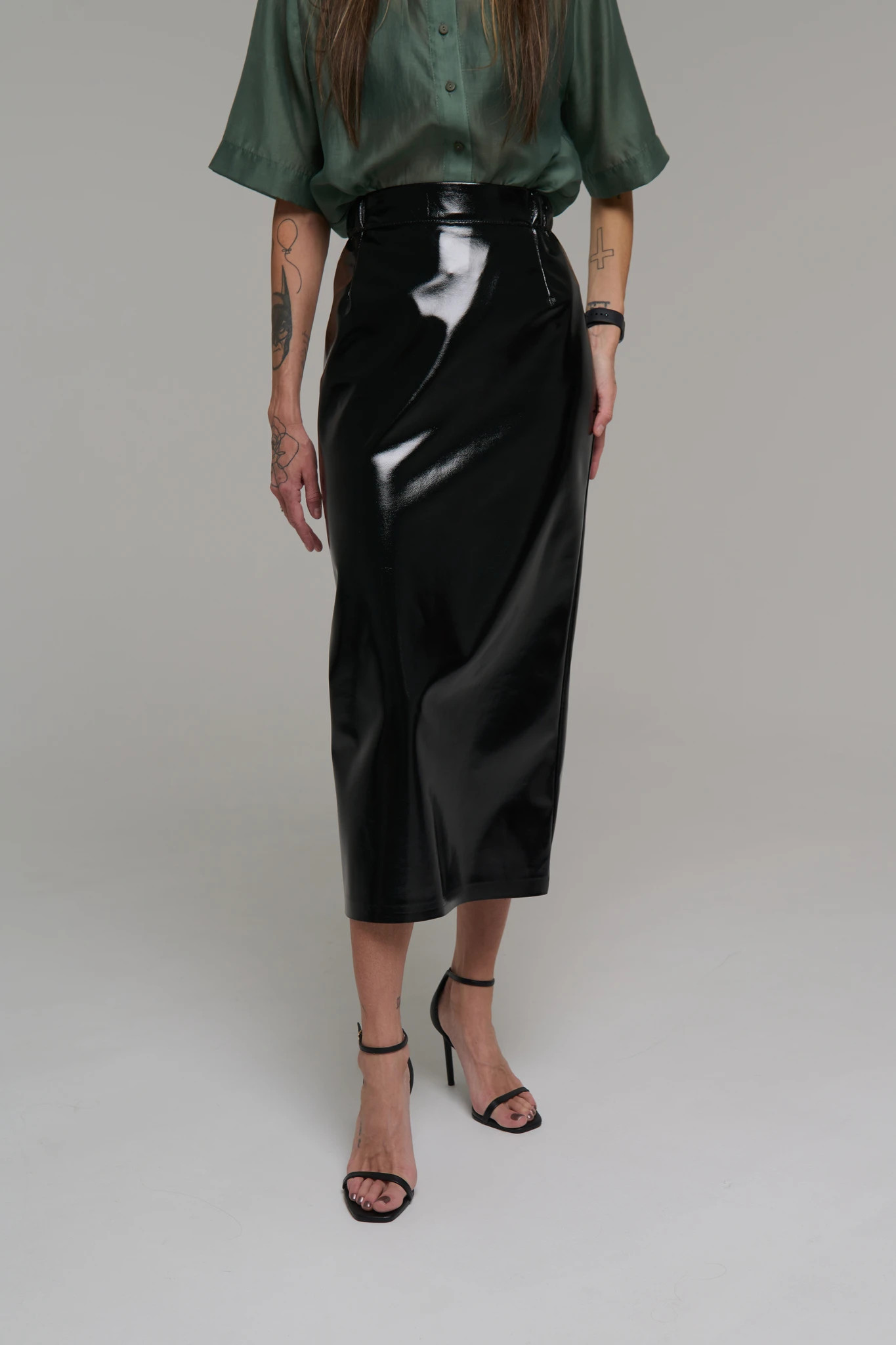 Юбка длины миди из искусственной кожи с глянцем. Пояс с эластичными вставками по бокам, фигурная кокетка с застежка на потайную молнию сзади. Шлица не сковывает движения. Для комфортной носки юбка имеет мягкую изнанку. Идеальный вариант для прохладного сезона.